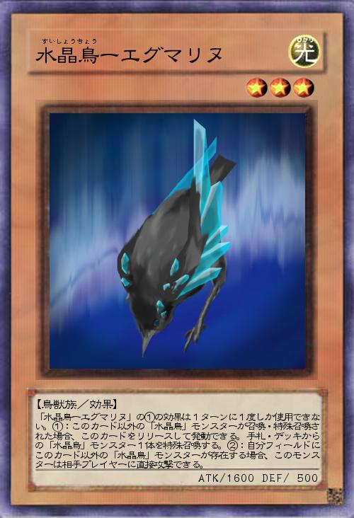 | 「水晶鳥ーエグマリヌ」の①の効果は1ターンに1度しか使用できない。①:このカード以外の「水晶鳥」モンスターが召喚・特殊召喚された場合、このカードをリリースして発動できる。手札・デッキからの「水晶烏」モンスター1体を特殊召喚する。②:自分フィールドにこのカード以外の「水晶鳥」モンスターが存在する場合、このモンスターは相手プレイヤーに直接攻撃できる。 | |||