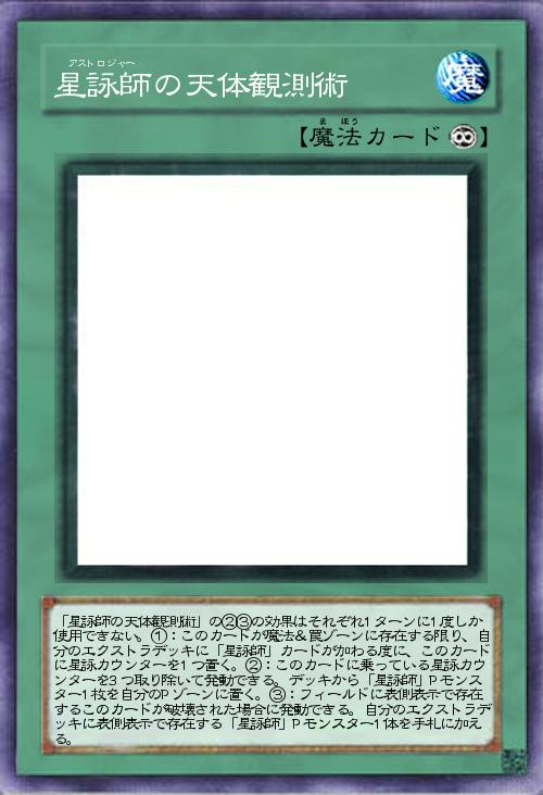 | 「星詠師の天体観測術」の②③の効果はそれぞれ1ターンに1度しか使用できない。①:このカードが魔法&罠ゾーンに存在する限り、自分のエクストラデッキに「星詠師」カードが加わる度に、このカードに星詠カウンターを1つ置く。②:このカードに乗っている星詠カウンターを3つ取り除いて発動できる。デッキから「星詠師」Pモンスター1枚を自分のPゾーンに置く。③:フィールドに表側表示で存在するこのカードが破壊された場合に発動できる。自分のエクストラデッキに表側表示で存在する「星詠師」Pモンスター1体を手札に加える。 | |||