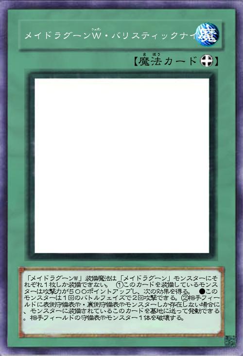 | 「メイドラグーンW」装備魔法は「メイドラグーン」モンスターにそれぞれ1枚しか装備できない。 ①このカードを装備しているモンスターは攻撃力が500ポイントアップし、次の効果を得る。 ●このモンスターは1回のバトルフェイズで2回攻撃できる。②相手フィールドに表側守備表示・裏側守備表示モンスターしか存在しない場合に、モンスターに装備されているこのカードを墓地に送って発動できる。相手フィールドの守備表示モンスター1体を破壊する。 | |||