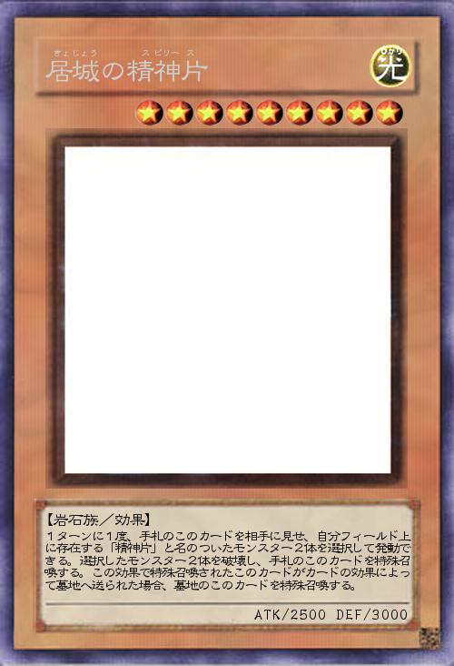 | 1ターンに1度、手札のこのカードを相手に見せ、自分フィールド上に存在する「精神片」と名のついたモンスター2体を選択して発動できる。選択したモンスター2体を破壊し、手札のこのカードを特殊召喚する。この効果で特殊召喚されたこのカードがカードの効果によって墓地へ送られた場合、墓地のこのカードを特殊召喚する。 | |||