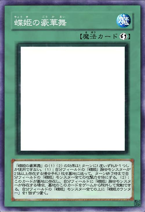 | 「蝶姫の豪華舞」の(1)(2)の効果は1ターンに1度いずれか1つしか使用できない。(1):自分フィールドの「蝶姫」融合モンスターが2体以上存在する場合手札1枚を墓地に送って。ターン終了時まで自分フィールドの「蝶姫」モンスター全ての攻撃力を倍にする。(2):このカードが墓地に存在し、自分フィールドに「蝶姫」融合モンスターが存在する場合、墓地のこのカードをゲームから除外して発動できる。自分フィールドの「蝶姫」モンスター全ての上に「蝶姫カウンター」を1個ずつ置く。 | |||