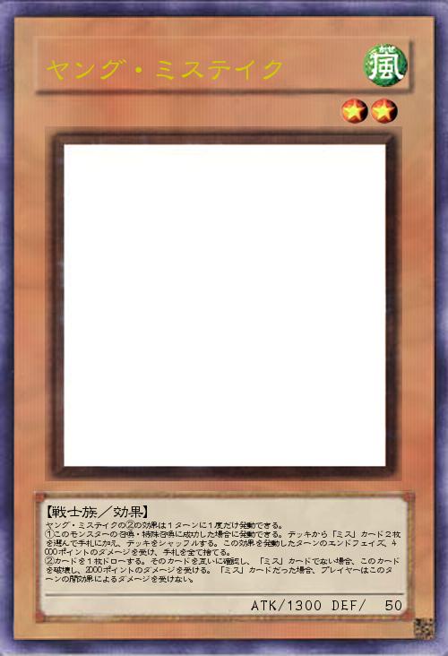 | ヤング・ミステイクの②の効果は1ターンに1度だけ発動できる。 ①このモンスターの召喚・特殊召喚に成功した場合に発動できる。デッキから「ミス」カード2枚を選んで手札に加え、デッキをシャッフルする。この効果を発動したターンのエンドフェイズ、4000ポイントのダメージを受け、手札を全て捨てる。 ②カードを1枚ドローする。そのカードを互いに確認し、「ミス」カードでない場合、このカードを破壊し、2000ポイントのダメージを受ける。「ミス」カードだった場合、プレイヤーはこのターンの間効果によるダメージを受けない。 | |||