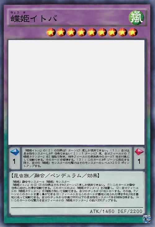 | 「蝶姫」融合モンスター+「蝶姫」モンスター 「蝶姫イトバ」の(2)(3)の効果はそれぞれ1ターンに1度しか使用できない。(1):このカードが融合召喚に成功した場合発動できる。このカードの上に「蝶姫カウンター」を2個置く。(2):自分フィールドの「蝶姫カウンター」を2個取り除いて発動できる。自分のデッキから1枚ドローする。その後、Pゾーンにこのカードを置く事ができる(3):フィールドからこのカードが墓地に送られた場合手札2枚を墓地に送って発動できる。自分のデッキから守備力1800以下の昆虫族モンスター1体を特殊召喚する。(4):このカードの攻撃力を自分フィールドの「蝶姫カウンター」の数×200アップする。 | |||