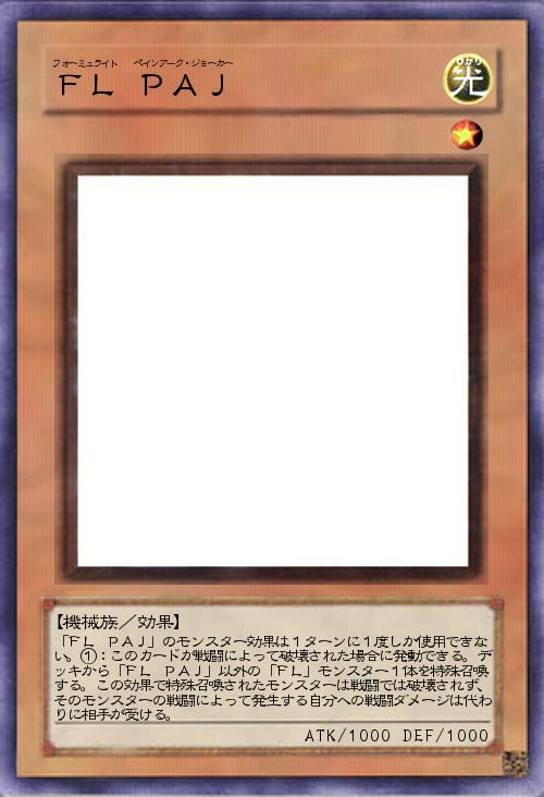 | 「FL PAJ」のモンスター効果は1ターンに1度しか使用できない。①:このカードが戦闘によって破壊された場合に発動できる。デッキから「FL PAJ」以外の「FL」モンスター1体を特殊召喚する。この効果で特殊召喚されたモンスターは戦闘では破壊されず、そのモンスターの戦闘によって発生する自分への戦闘ダメージは代わりに相手が受ける。 | |||