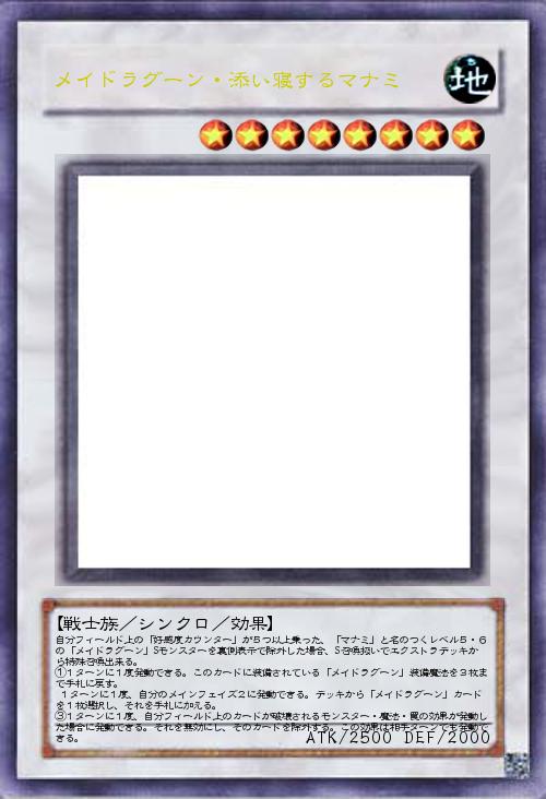 | 自分フィールド上の「好感度カウンター」が5つ以上乗った、「マナミ」と名のつくレベル5・6の「メイドラグーン」Sモンスターを裏側表示で除外した場合、S召喚扱いでエクストラデッキから特殊召喚出来る。 ①1ターンに1度発動できる。このカードに装備されている「メイドラグーン」装備魔法を3枚まで手札に戻す。 ➁1ターンに1度、自分のメインフェイズ2に発動できる。デッキから「メイドラグーン」カードを1枚選択し、それを手札に加える。 ③1ターンに1度、自分フィールド上のカードが破壊されるモンスター・魔法・罠の効果が発動した場合に発動できる。それを無効にし、そのカードを除外する。この効果は相手ターンでも発動できる。 | |||