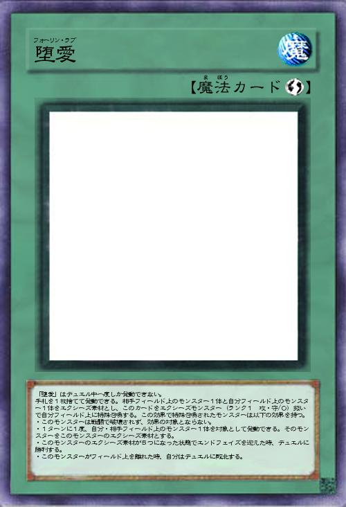 | 「堕愛」はデュエル中一度しか発動できない。 手札を1枚捨てて発動できる。相手フィールド上のモンスター1体と自分フィールド上のモンスター1体をエクシーズ素材とし、このカードをエクシーズモンスター(ランク1 攻・守/0)扱いで自分フィールド上に特殊召喚する。この効果で特殊召喚されたモンスターは以下の効果を持つ。 ・このモンスターは戦闘で破壊されず、効果の対象とならない。 ・1ターンに1度、自分・相手フィールド上のモンスター1体を対象として発動できる。そのモンスターをこのモンスターのエクシーズ素材とする。 ・このモンスターのエクシーズ素材が5つになった状態でエンドフェイズを迎えた時、デュエルに勝利する。 ・このモンスターがフィールド上を離れた時、自分はデュエルに敗北する。 | |||