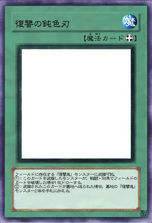 | フィールドに存在する「復讐鬼」モンスターに装備可能。 ①:このカードを装備したモンスターが、戦闘・効果でフィールドのカードを破壊した場合1枚ドローする。 ②:装備されたこのカードが墓地へ送られた場合。墓地の「復讐鬼」モンスター2体を手札に加える。 | |||