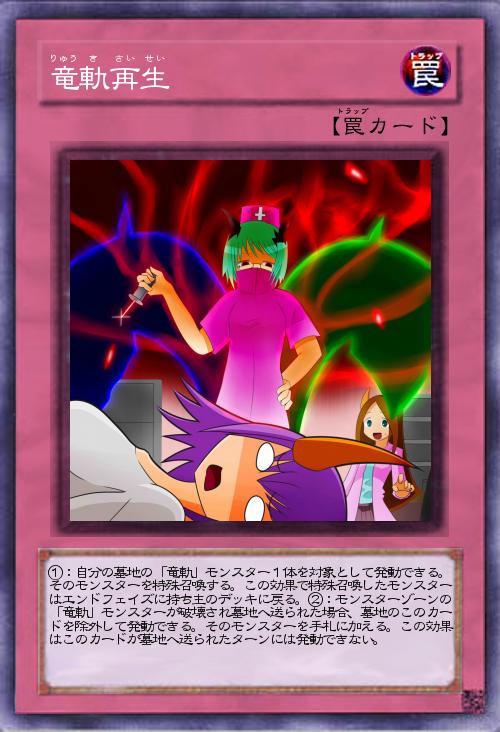 「ギャグっぽいイラストだけど、デッキバウンスしてしまうが蘇生する効果、使ったターンは使えない墓地へ行く竜軌を手札に回収する効果、使えるなぁ。」(2016-06-01 22:20)