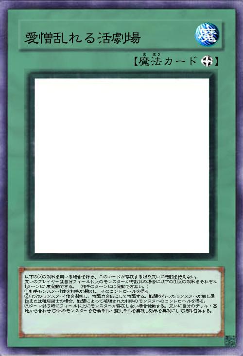 | 以下の②の効果を用いる場合を除き、このカードが存在する限り互いに戦闘を行えない。 互いのプレイヤーは自分フィールド上のモンスターが奇数体の場合に以下の①②の効果をそれぞれ1ターンに1度発動できる。(相手のターンには発動できない。) ①相手モンスター1体を相手が選択し、そのコントロールを得る。 ②自分のモンスター1体を選択し、攻撃力を倍にして攻撃する。戦闘を行ったモンスターが同じ属性または種族同士の場合、戦闘によって破壊された相手のモンスターのコントロールを得る。 ③ターン終了時にフィールド上にモンスターが存在しない場合発動する。互いに自分のデッキ・墓地から合わせて2体のモンスターを召喚条件・蘇生条件を無視し効果を無効にして特殊召喚する。 | |||