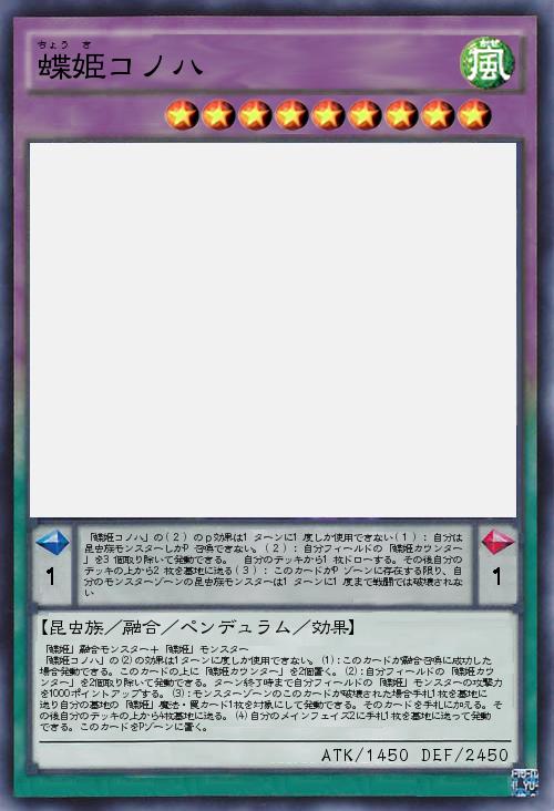 | 「蝶姫」融合モンスター+「蝶姫」モンスター 「蝶姫コノハ」の(2)の効果は1ターンに度しか使用できない。(1):このカードが融合召喚に成功した場合発動できる。このカードの上に「蝶姫カウンター」を2個置く。(2):自分フィールドの「蝶姫カウンター」を2個取り除いて発動できる。ターン終了時まで自分フィールドの「蝶姫」モンスターの攻撃力を1000ポイントアップする。(3):モンスターゾーンのこのカードが破壊された場合手札1枚を墓地に送り自分の墓地の「蝶姫」魔法・罠カード1枚を対象にして発動できる。そのカードを手札に加える。その後自分のデッキの上から4枚墓地に送る。(4)自分のメインフェイズ2に手札1枚を墓地に送って発動できる。このカードをPゾーンに置く。 | |||