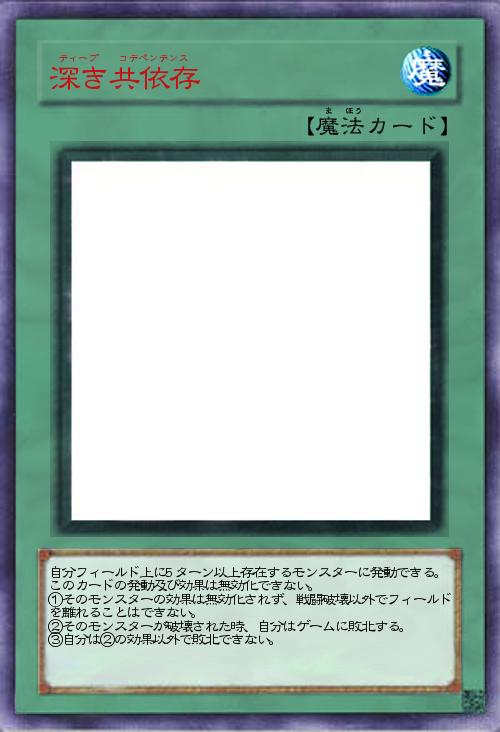 | 自分フィールド上に5ターン以上存在するモンスターに発動できる。このカードの発動及び効果は無効化できない。 ①そのモンスターの効果は無効化されず、戦闘破壊以外でフィールドを離れることはできない。 ②そのモンスターが破壊された時、自分はゲームに敗北する。 ③自分は②の効果以外で敗北できない。 | |||