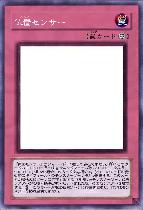 | 「位置センサー」はフィールドに1枚しか存在できない。①:このカードのコントローラーは自分エンドフェイズ毎に1000LPを払う。1000LP払えない場合このカードを破壊する。②:このカードの発動時に相手フィールドのモンスターゾーンを3つ選択する。このカードが魔法&罠ゾーンに存在する限り、選択したモンスターゾーンにモンスターが召喚・特殊召喚・セットされた時、そのモンスターを破壊する。③:このカードが魔法&罠ゾーンに存在する限り、自分はモンスターを特殊召喚できない。 | |||