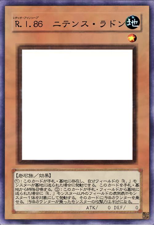 | ①:このカードが手札・墓地に存在し、自分フィールドの「R.」モンスターが墓地に送られた場合に発動できる。このカードを手札・墓地から特殊召喚する。②:このカードが手札・フィールドから墓地に送られた場合に「R.」モンスター以外のフィールドの表側表示モンスター1体を対象にして発動する。そのカードに汚染カウンターを乗せる。汚染カウンターが乗ったモンスターの攻撃力は半分になる。 | |||