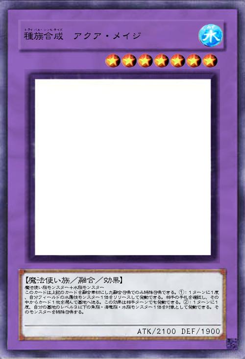 | 魔法使い族モンスター+水族モンスター このカードは上記のカードを融合素材にした融合召喚でのみ特殊召喚できる。①:1ターンに1度、自分フィールドの水属性モンスター1体をリリースして発動できる。相手の手札を確認し、その中からカード1枚を選んで墓地へ送る。この効果は相手ターンでも発動できる。②:1ターンに1度、自分の墓地のレベル3以下の魚族・海竜族・水族モンスター1体を対象として発動できる。そのモンスターを特殊召喚する。 | |||