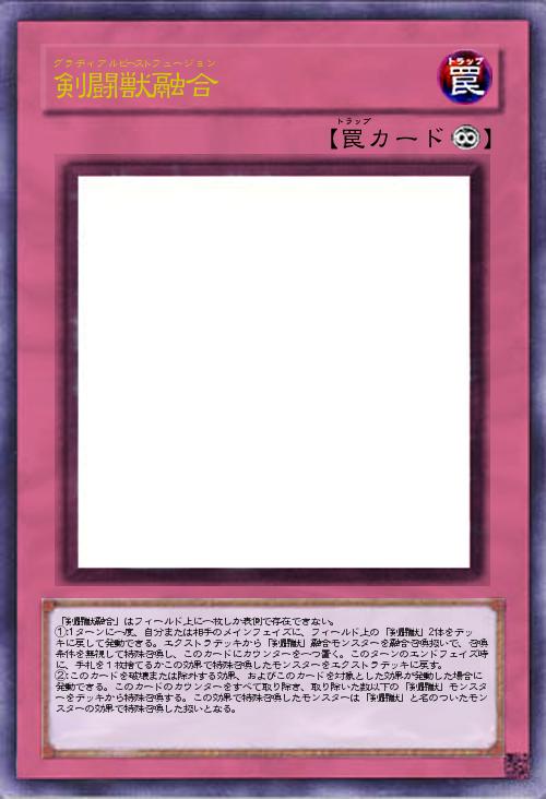| 「剣闘獣融合」はフィールド上に一枚しか表側で存在できない。 ①:1ターンに一度、自分または相手のメインフェイズに、フィールド上の「剣闘獣」2体をデッキに戻して発動する。エクストラデッキから「剣闘獣」融合モンスターを融合召喚扱いで召喚条件を無視して特殊召喚し、このカードにカウンターを一つ置く。このターンのエンドフェイズ時に、手札を1枚捨てるかこの効果で特殊召喚したモンスターをエクストラデッキに戻す。 ②:このカードを破壊または除外する効果、およびこのカードを対象とした効果が発動した場合に発動できる。このカードのカウンターをすべて取り除き、取り除いた数以下の「剣闘獣」モンスターをデッキから特殊召喚する。この効果で特殊召喚したモンスターは「剣闘獣」と名のついたモンスターの効果で特殊召喚した扱いとなる。 | |||