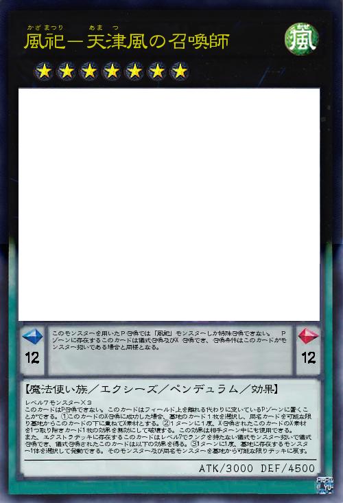 | このモンスターを用いたP召喚では「風祀」モンスターしか特殊召喚できない。 Pゾーンに存在するこのカードは儀式召喚及びX召喚でき、召喚条件はこのカードがモンスター扱いである場合と同様となる。 | |||