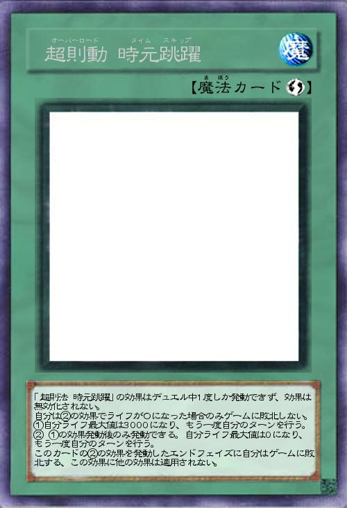 | 「超則法 時元跳躍」の効果はデュエル中1度しか発動できず、効果は無効化されない。 自分は②の効果でライフが0になった場合のみゲームに敗北しない。 ①自分ライフ最大値は3000になり、もう一度自分のターンを行う。 ② ①の効果発動後のみ発動できる。自分ライフ最大値は0になり、もう一度自分のターンを行う。 このカードの②の効果を発動したエンドフェイズに自分はゲームに敗北する、この効果に他の効果は適用されない。 | |||