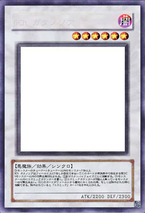 | Chモンスターのチューナー+チューナー以外のモンスター1体以上 GCh ガタノソアはフィールド上に1体しか存在できない①このカードが表側表示で存在する限りChモンスター以外の効果は無効化される。②自分スタンバイフェイズごとに発動する。Chモンスター以外にコズミックカウンターを置く。③コズミックカウンターが3個以上乗っているモンスターは攻撃出来ない。④このカードがフィールドから墓地におくられた時、もしくは除外された時に発動できる。除外されていると「コズミック」カード1枚を手札に加える。 | |||
