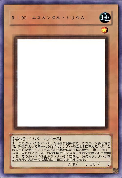 | ①:このカードがリバースした場合に発動する。このターン終了時まで、効果によって置かれる汚染カウンターの数は1個増える。②:このカードが手札・フィールドから墓地に送られた場合、「R.」モンスター以外のフィールドの表側表示モンスター1体を対象にして発動する。そのカードに汚染カウンターを1個置く。汚染カウンターが置かれたモンスターの攻撃力は1個につき半分になる。 | |||