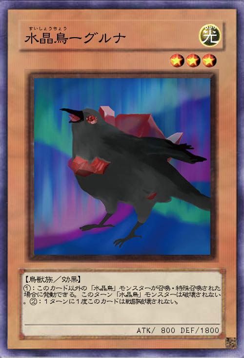場に水晶鳥が現れれば全ての水晶鳥に破壊耐性を付与する守り神。自身も1度だけ戦闘で破壊されないので、防御能力はかなり高いですね。」(2016-06-08 22:33)