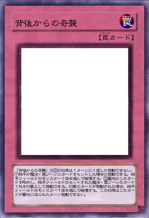 | 「背後からの奇襲」の②の効果は1ターンに1度しか発動できない。①相手が魔法・罠ゾーンにカードをセットした場合に発動できる。相手フィールドのモンスター1体を選んで破壊する。②墓地のこのカードを除外し、相手フィールドのセットされた魔法・罠ゾーンのカード1枚を対象として発動できる。対象のカードが発動された場合、相手フィールドのモンスター1体を選んで破壊する。この効果はこのカードが墓地に送られたターン発動できない。 | |||