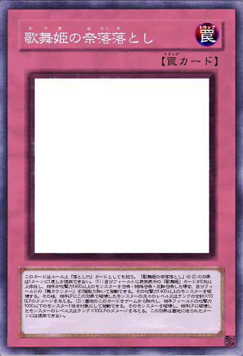 | このカードはルール上「落とし穴」カードとしても扱う。「歌舞姫の奈落落とし」の(2)の効果は1ターンに1度しか使用できない。(1):自分フィールドに表側表示の「歌舞姫」カードが2枚以上存在し、相手が攻撃力1400以上のモンスターを召喚・特殊召喚・反転召喚した場合、自分フィールドの「舞カウンター」を3個取り除いて発動できる。その攻撃力1400以上のモンスターを破壊する。その後、相手LPにこの効果で破壊したモンスターの元々のレベル又はランクの合計×100LPのダメージを与える。(2):墓地のこのカードをゲームから除外し、相手フィールドの攻撃力1000以下のモンスター1体を対象にして発動できる。そのモンスターを破壊し、相手LPに破壊したモンスターのレベル又はランク×100LPのダメージを与える。この効果は墓地に送られたターンには使用できない。 | |||