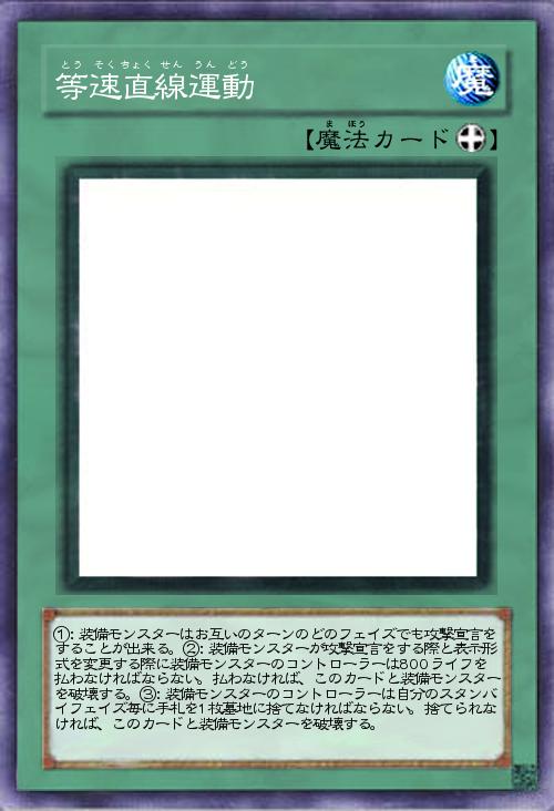 | ①:装備モンスターはお互いのターンのどのフェイズでも攻撃宣言をすることが出来る。②:装備モンスターが攻撃宣言をする際と表示形式を変更する際に装備モンスターのコントローラーは800ライフを払わなければならない。払わなければ、このカードと装備モンスターを破壊する。③:装備モンスターのコントローラーは自分のスタンバイフェイズ毎に手札を1枚墓地に捨てなければならない。捨てられなければ、このカードと装備モンスターを破壊する。 | |||
