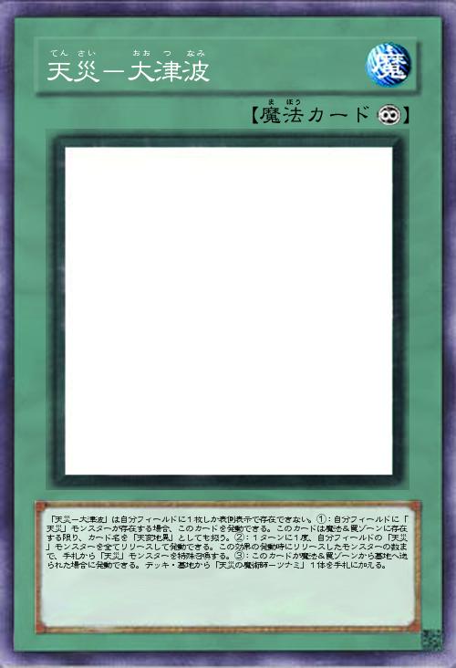 | 「天災-大津波」は自分フィールドに1枚しか表側表示で存在できない。①:自分フィールドに「天災」モンスターが存在する場合、このカードを発動できる。このカードは魔法&罠ゾーンに存在する限り、カード名を「天変地異」としても扱う。②:1ターンに1度、自分フィールドの「天災」モンスターを全てリリースして発動できる。この効果の発動時にリリースしたモンスターの数まで、手札から「天災」モンスターを特殊召喚する。③:このカードが魔法&罠ゾーンから墓地へ送られた場合に発動できる。デッキ・墓地から「天災の魔術師-ツナミ」1体を手札に加える。 | |||