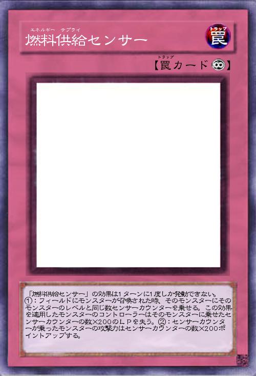 | 「燃料供給センサー」の効果は1ターンに1度しか発動できない。 ①:フィールドにモンスターが召喚された時、そのモンスターにそのモンスターのレベルと同じ数センサーカウンターを乗せる。この効果を適用したモンスターのコントローラーはそのモンスターに乗せたセンサーカウンターの数×200のLPを失う。②:センサーカウンターが乗ったモンスターの攻撃力はセンサーカウンターの数×200ポイントアップする。 | |||