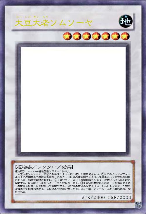 | 植物族チューナー+植物族モンスター1体以上 「大豆大老ソムソーヤ」の②の効果は1ターンに1度しか使用できない。①:このカードがフィールド上に表側表示で存在する限り、このカード以外の植物族モンスターは相手カードの効果の対象にならず、効果で破壊されない。②:自分フィールド上の植物族モンスターが墓地へ送られた時に発動する。自分はデッキからカードを1枚ドローする。③:自分の墓地にこのカードが存在する時、墓地のこのカードを除外して発動できる。自分の墓地に存在する「ビーンズ」モンスター1体を守備表示で特殊召喚する。この効果で特殊召喚したモンスターは、フィールド上から離れた時、除外される。 | |||