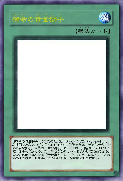 | 「宿命の黄金獅子」の①②の効果は1ターンに1度、いずれか1つしか使用できない。①:手札を1枚捨てて発動できる。デッキから「宿命の黄金獅子」以外の「黄金獅子」カード2枚(同名カードは1枚まで)を手札に加える。②:墓地のこのカードを除外して発動できる。自分の墓地に存在する「黄金獅子」カード1枚を手札に加える。この効果はこのカードが墓地に送られたターンには発動できない。 | |||