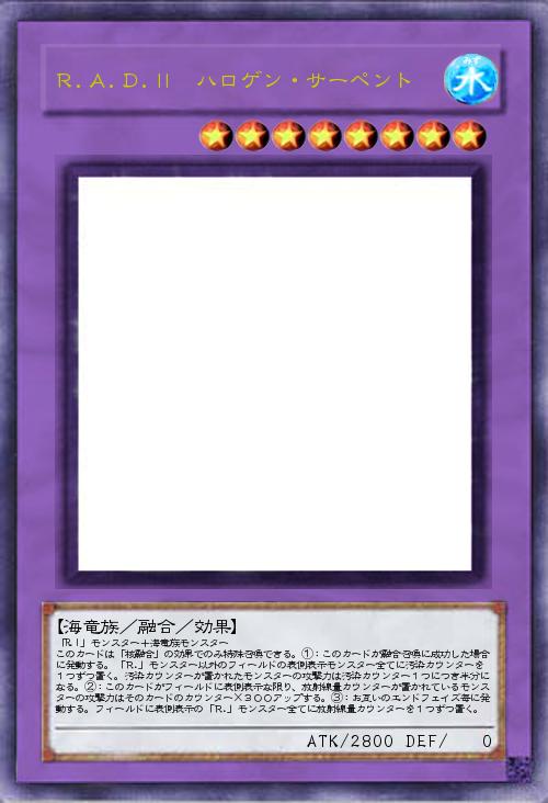 | 「R.I」モンスター+海竜族モンスター このカードは「核融合」の効果でのみ特殊召喚できる。①:このカードが融合召喚に成功した場合に発動する。「R.」モンスター以外のフィールドの表側表示モンスター全てに汚染カウンターを1つずつ置く。汚染カウンターが置かれたモンスターの攻撃力は汚染カウンター1つにつき半分になる。②:このカードがフィールドに表側表示な限り、放射線量カウンターが置かれているモンスターの攻撃力はそのカードのカウンター×300アップする。③:お互いのエンドフェイズ毎に発動する。フィールドに表側表示の「R.」モンスター全てに放射線量カウンターを1つずつ置く。 | |||