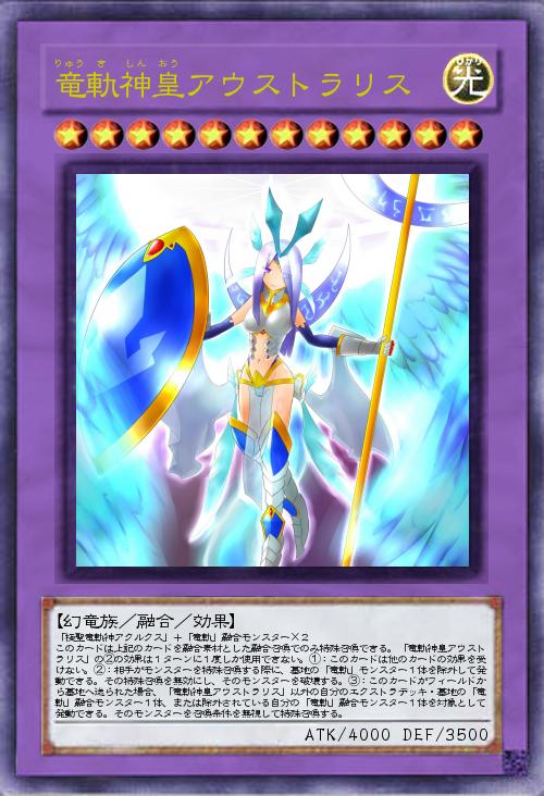 | 「極聖竜軌神アクルクス」+「竜軌」融合モンスター×2 このカードは上記のカードを融合素材とした融合召喚でのみ特殊召喚できる。「竜軌神皇アウストラリス」の②の効果は1ターンに1度しか使用できない。①:このカードは他のカードの効果を受けない。②:相手がモンスターを特殊召喚する際に、墓地の「竜軌」モンスター1体を除外して発動できる。その特殊召喚を無効にし、そのモンスターを破壊する。③:このカードがフィールドから墓地へ送られた場合、「竜軌神皇アウストラリス」以外の自分のエクストラデッキ・墓地の「竜軌」融合モンスター1体、または除外されている自分の「竜軌」融合モンスター1体を対象として発動できる。そのモンスターを召喚条件を無視して特殊召喚する。 | |||
