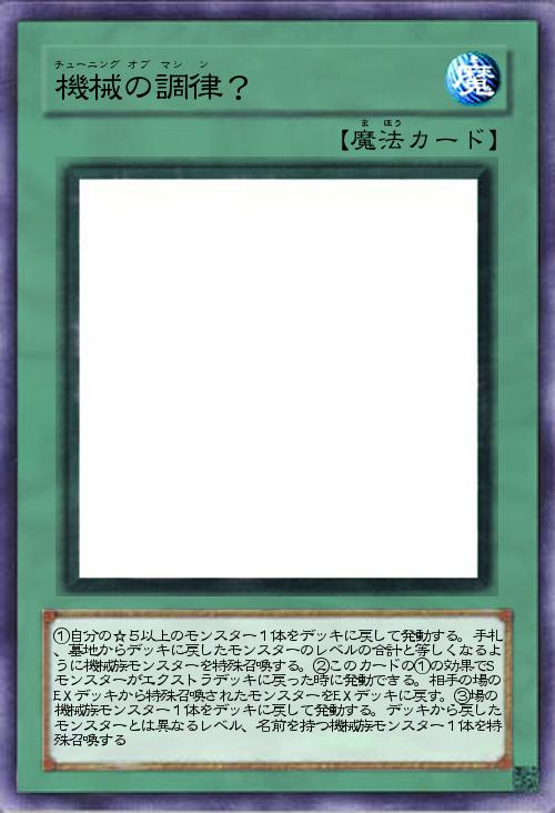 | ①自分の☆5以上のモンスター1体をデッキに戻して発動する。手札、墓地からデッキに戻したモンスターのレベルの合計と等しくなるように機械族モンスターを特殊召喚する。②このカードの①の効果でSモンスターがエクストラデッキに戻った時に発動できる。相手の場のEXデッキから特殊召喚されたモンスターをEXデッキに戻す。③場の機械族モンスター1体をデッキに戻して発動する。デッキから戻したモンスターとは異なるレベル、名前を持つ機械族モンスター1体を特殊召喚する | |||