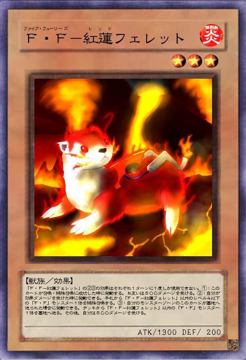 | 「F・F-紅蓮フェレット」の②③の効果はそれぞれ1ターンに1度しか使用できない。①:このカードが召喚・特殊召喚に成功した時に発動する。お互いは500ダメージを受ける。②:自分が効果ダメージを受けた時に発動できる。手札から「F・F-紅蓮フェレット」以外のレベル4以下の「F・F」モンスター1体を特殊召喚する。③:自分のモンスターゾーンのこのカードが墓地へ送られた場合に発動できる。デッキから「F・F-紅蓮フェレット」以外の「F・F」モンスター1体を墓地へ送る。その後、自分は500ダメージを受ける。 | |||