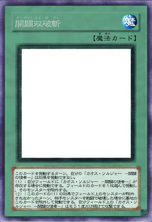 | このカードを発動するターン、自分の「カオス・ソルジャー -開闢の使者-」は効果を発動できない。 (1):自分フィールドに「カオス・ソルジャー -開闢の使者-」が存在する場合に発動できる。フィールドのカードを1枚選んで発動し、そのモンスターを除外する。 (2):このカードの(1)の効果でフィールド上のモンスターが除外されなかったターン、相手モンスターを戦闘で破壊した場合に墓地のこのカードを除外して発動できる。自分フィールド上の「カオス・ソルジャー -開闢の使者-」はもう1度だけ続けて攻撃できる。 | |||