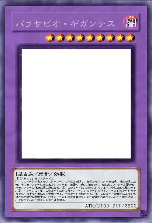 | 「パラサビオ」モンスター×2 ①:このカードが自分モンスターゾーンに存在する限り、相手がモンスターを召喚・特殊召喚した時、そのモンスターに寄生蟲カウンターを1個置く(最大1個まで)。寄生蟲カウンターが置かれたモンスターの種族は昆虫族になる。②:このカードは1度のバトルフェイズ中に2回攻撃できる。③:1ターンに1度、このカード以外の自分フィールドのカードと相手フィールドのカードをそれぞれ1枚ずつ対象にして発動できる。そのカードを除外する。④:このカードが相手によって破壊された場合に発動する。相手フィールドの寄生蟲カウンターが置かれたモンスター1体を選択し、そのモンスターのコントロールを得る。 | |||