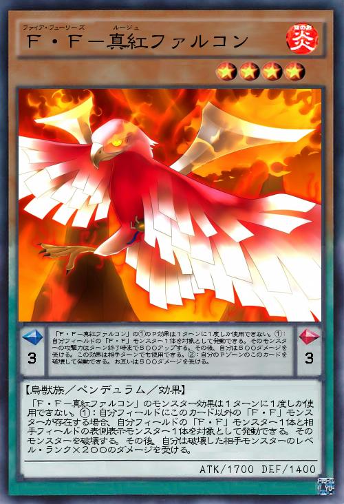 | 「F・F-真紅ファルコン」のモンスター効果は1ターンに1度しか使用できない。①:自分フィールドにこのカード以外の「F・F」モンスターが存在する場合、自分フィールドの「F・F」モンスター1体と相手フィールドの表側表示モンスター1体を対象として発動できる。そのモンスターを破壊する。その後、自分は破壊した相手モンスターのレベル・ランク×200のダメージを受ける。 | |||