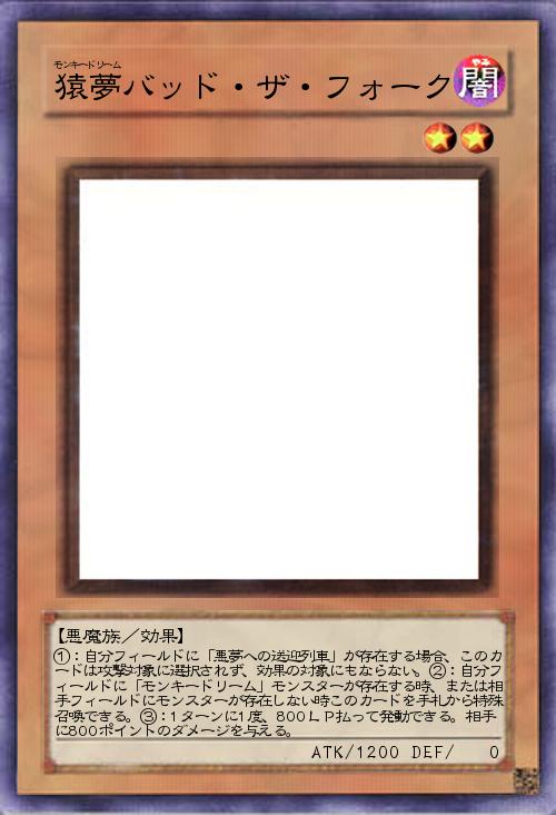 | ①:自分フィールドに「悪夢への送迎列車」が存在する場合、このカードは攻撃対象に選択されず、効果の対象にもならない。②:自分フィールドに「モンキードリーム」モンスターが存在する時、または相手フィールドにモンスターが存在しない時このカードを手札から特殊召喚できる。③:1ターンに1度、800LP払って発動できる。相手に800ポイントのダメージを与える。 | |||