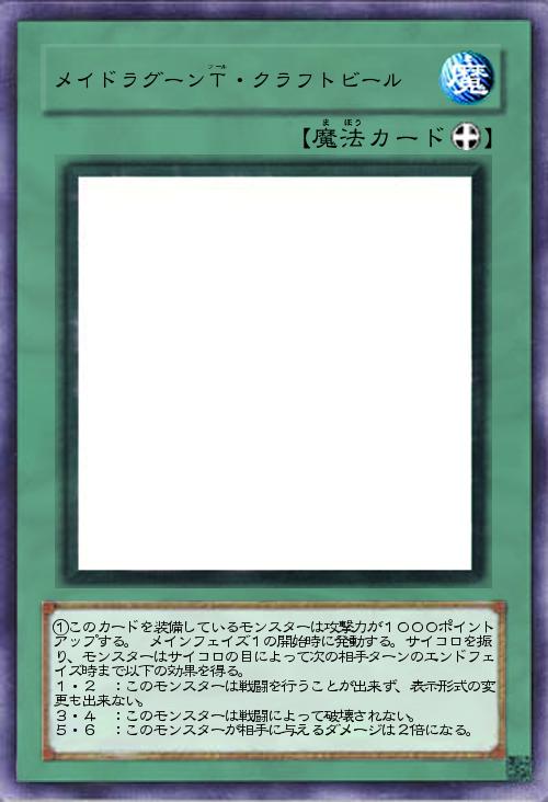| ①このカードを装備しているモンスターは攻撃力が1000ポイントアップする。➁メインフェイズ1の開始時に発動する。サイコロを振り、モンスターはサイコロの目によって次の相手ターンのエンドフェイズ時まで以下の効果を得る。 1・2 :このモンスターは戦闘を行うことが出来ず、表示形式の変更も出来ない。 3・4 :このモンスターは戦闘によって破壊されない。 5・6 :このモンスターが相手に与えるダメージは2倍になる。 | |||