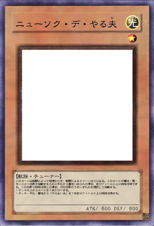 このカードは戦闘によって破壊されず、戦闘によるダメージは0になる。このカードが魔法・罠・モンスター効果を発動するために手札から墓地へ送られた場合、自分フィールド上に特殊召喚できる。この効果で特殊召喚した場合、次の効果のうちいずれかを選択して発動する。 ・デッキの上からカードを1枚ドローする。 ・デッキ・手札・墓地から「やらない夫」を1体自分フィールド上に特殊召喚する。 |