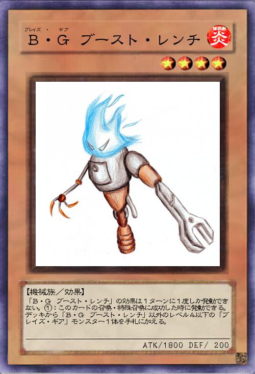 | 「B・G ブースト・レンチ」の効果は1ターンに1度しか発動できない。①:このカードの召喚・特殊召喚に成功した時に発動できる。デッキから「B・G ブースト・レンチ」以外のレベル4以下の「ブレイズ・ギア」モンスター1体を手札に加える。 | |||
