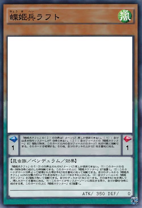 | 「蝶姫兵ラフト」の(1)(3)の効果はそれぞれ1ターンに1度しか使用できない。(1):このカードの召喚・特殊召喚に成功した時発動できる。このカードの上に「蝶姫カウンター」を1個置く。(2):このカードがカード効果よって破壊された場合手札1枚を墓地に送って発動できる。自分のデッキから「蝶姫兵ラフト」以外の攻撃力500以下の昆虫族モンスター1体を手札に加える。(3):自分フィールドの「蝶姫カウンター」を2個取り除いて発動できる。自分のデッキから1枚ドローする。その後手札1枚を選んで、選んだカードを墓地に送る。(4):このカードがモンスターゾーンに存在する限り、自分が融合召喚に成功する度、このカードの上に「蝶姫カウンター」を2個置く。 | |||