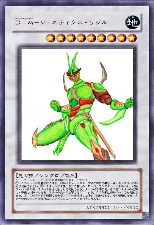 | チューナー+チューナー以外の昆虫族モンスター1体以上 ①:このカードが戦闘を行う場合、相手はダメージステップ終了時まで魔法・罠・モンスターの効果を発動できない。②:1ターンに1度、自分の墓地の「D=M」モンスター1体を除外し、相手フィールドのモンスター1体を対象として発動できる。ターン終了時まで、そのモンスターの攻撃力・守備力は除外したモンスターの元々の攻撃力分ダウンする。この効果は相手ターンでも発動できる。③:このカードが戦闘で相手モンスターを破壊した場合に発動できる。その破壊したモンスターの元々のレベルまたはランク×200ダメージを相手に与える。 | |||