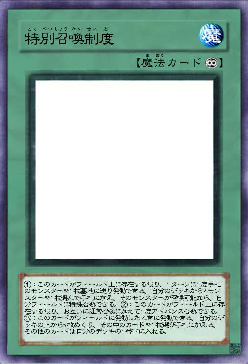 | ①:このカードがフィールド上に存在する限り、1ターンに1度手札のモンスターを1枚墓地に送り発動できる。自分のデッキからPモンスターを1枚選んで手札に加え、そのモンスターが召喚可能なら、自分フィールドに特殊召喚できる。②:このカードがフィールド上に存在する限り、お互いに通常召喚に加えて1度アドバンス召喚できる。③:このカードがフィールドに発動したときに発動できる。自分のデッキの上から5枚めくり、その中のカードを1枚選び手札に加える。その他のカードは自分のデッキの1番下に入れる。 | |||