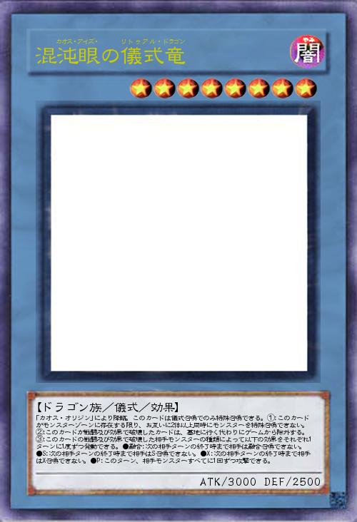 | 「カオス・オリジン」により降臨。このカードは儀式召喚でのみ特殊召喚できる。①:このカードがモンスターゾーンに存在する限り、お互いに2体以上同時にモンスターを特殊召喚できない。 ②:このカードが戦闘及び効果で破壊したカードは、墓地に行く代わりにゲームから除外する。 ③:このカードの戦闘及び効果で破壊した相手モンスターの種類によって以下の効果をそれぞれ1ターンに1度ずつ発動できる。●融合:次の相手ターンの終了時まで相手は融合召喚できない。 ●S:次の相手ターンの終了時まで相手はS召喚できない。●X:次の相手ターンの終了時まで相手はX召喚できない。●P:このターン、相手モンスターすべてに1回ずつ攻撃できる。 | |||