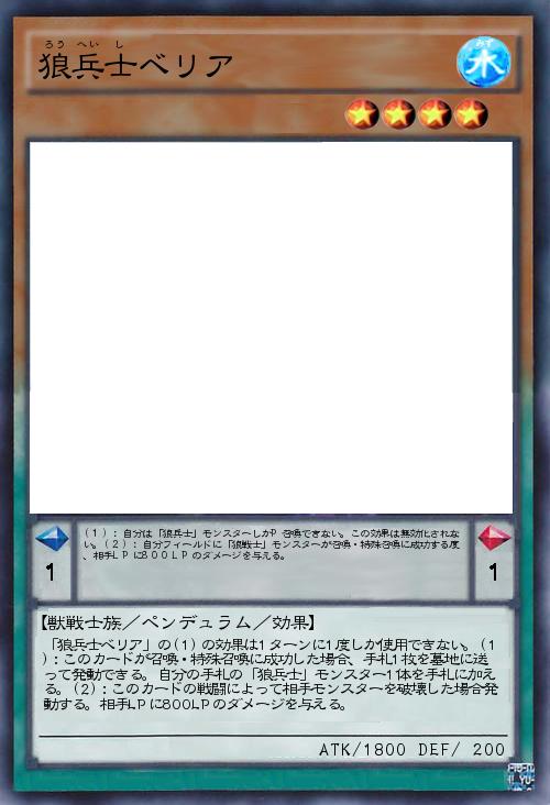 | (1):自分は「狼兵士」モンスターしかP召喚できない。この効果は無効化されない。(2):自分フィールドに「狼戦士」モンスターが召喚・特殊召喚に成功する度、相手LPに800LPのダメージを与える。 | |||