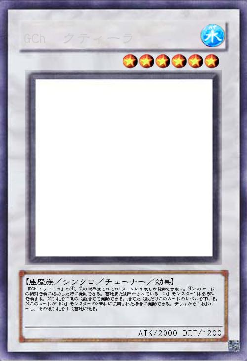 | 「GCh クティーラ」の①、②の効果はそれぞれ1ターンに1度しか発動できない。①このカードの特殊召喚に成功した時に発動できる。墓地または除外されている「Ch」モンスター1体を特殊召喚する。②手札を任意の枚数捨てて発動できる。捨てた枚数だけこのカードのレベルを下げる。③このカードが「Ch」モンスターのS素材に使用された場合に発動できる。デッキから1枚ドローし、その後手札を1枚墓地に送る。 | |||