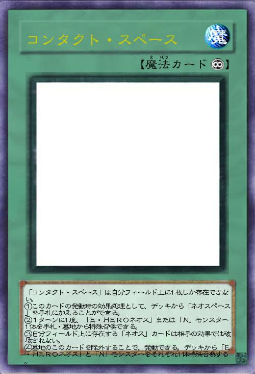 | 「コンタクト・スペース」は自分フィールド上に1枚しか存在できない。 ①このカードの発動時の効果処理として、デッキから「ネオスペース」を手札に加えることができる。 ②1ターンに1度、「E・HEROネオス」または「N」モンスター1体を手札・墓地から特殊召喚できる。 ③自分フィールド上に存在する「ネオス」カードは相手の効果では破壊されない。 ④墓地のこのカードを除外することで、発動できる。デッキから「E・HEROネオス」と「N」モンスターをそれぞれ1体特殊召喚する。 | |||
