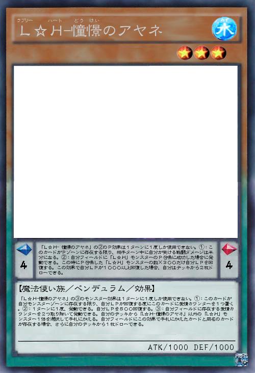 | 「L☆H-憧憬のアヤネ」の③のモンスター効果は1ターンに1度しか使用できない。①:このカードが自分モンスターゾーンに存在する限り、自分LPが回復する度にこのカードに愛情カウンターを1つ置く。②:1ターンに1度、発動できる。自分LPを500回復する。③:自分フィールドに存在する愛情カウンターを2つ取り除いて発動できる。自分のデッキから「L☆H-憧憬のアヤネ」以外の「L☆H」モンスター1体を選択して手札に加える。自分フィールドにこの効果で手札に加えたカードと同名のカードが存在する場合、さらに自分のデッキから1枚ドローできる。 | |||